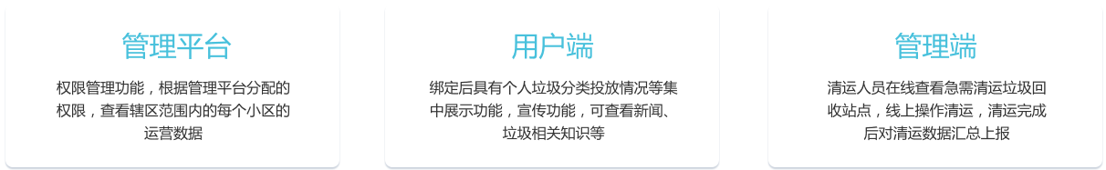 對(duì)垃圾分類進(jìn)行智能化精細(xì)管理,通過(guò)平臺(tái)管理,實(shí)現(xiàn)綜合、完善、高效的垃圾投放、 回收及利用,各垃圾站實(shí)行全天候監(jiān)控,最終實(shí)現(xiàn)人、事物的高效追蹤和管理。 |