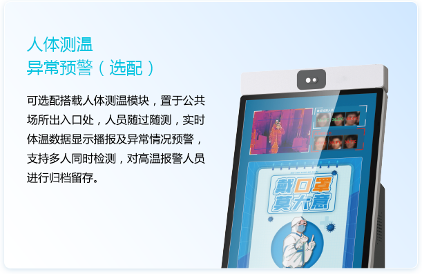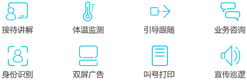32寸主屏搭載可定制化模塊,提供迎賓接待、業(yè)務(wù)咨詢、體溫監(jiān)測(cè)等特色服務(wù)的智能大屏機(jī)器人。可實(shí)現(xiàn)接待講解、引導(dǎo)跟隨、宣傳巡邏等功能,還可提供人臉識(shí)別、二維碼掃描、身份證讀取、叫號(hào)、打印等特色服務(wù)。