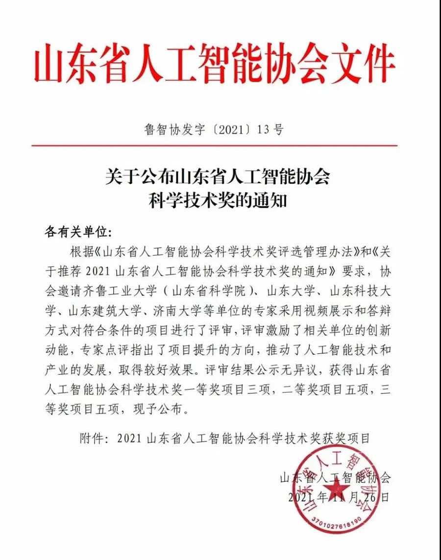 喜報|創(chuàng)澤集團榮獲2021山東省人工智能協(xié)會科學(xué)技術(shù)獎一等獎