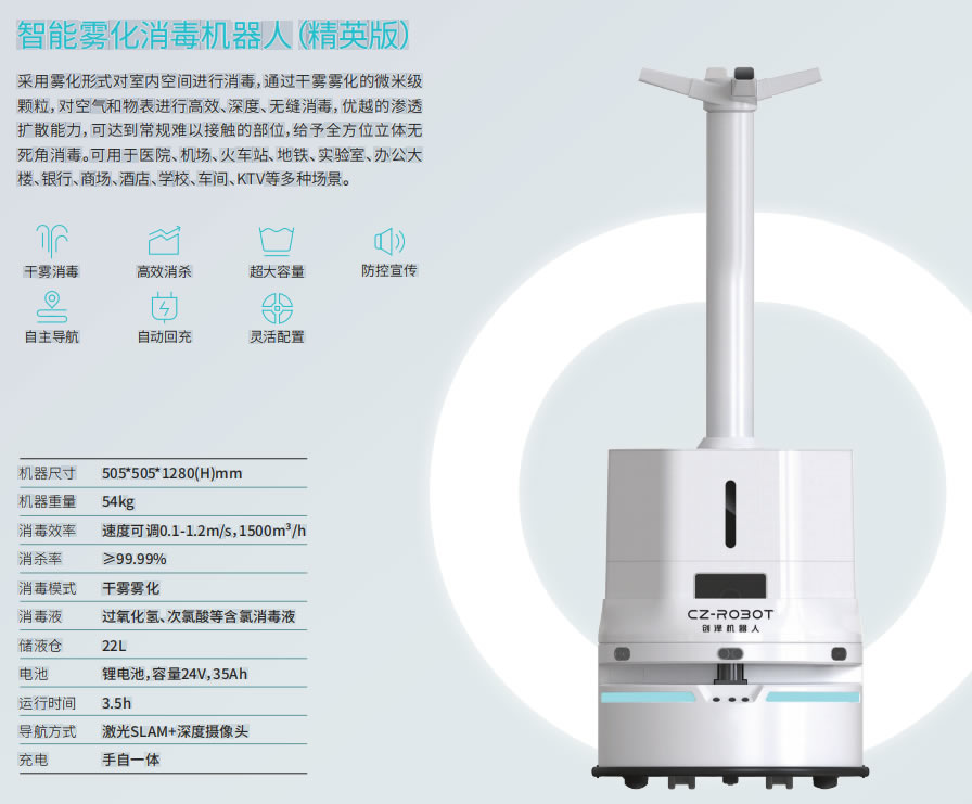 創澤精英版霧化消毒機器人以輪式機器人底盤為載體,采用霧化形式對室內空間進行消毒,通過干霧霧化的微米級 顆粒,對空氣和物表進行G效、深度、無縫消毒,優越的滲透 擴散能力,可達到常規難以接觸的部位,給予全方位立體無 死角消毒?捎糜卺t院、機場、火車站、地鐵、實驗室、辦公大樓、銀行、商場、酒店、學校、車間、KTV等多種場景